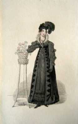 Here is a Regency Mourning Gown…there are a lot more feathers and fanciness than I would expect from a woman in the midst of grief. Of course, when you stay in mourning for a year or more, who wouldn’t want to look good?
